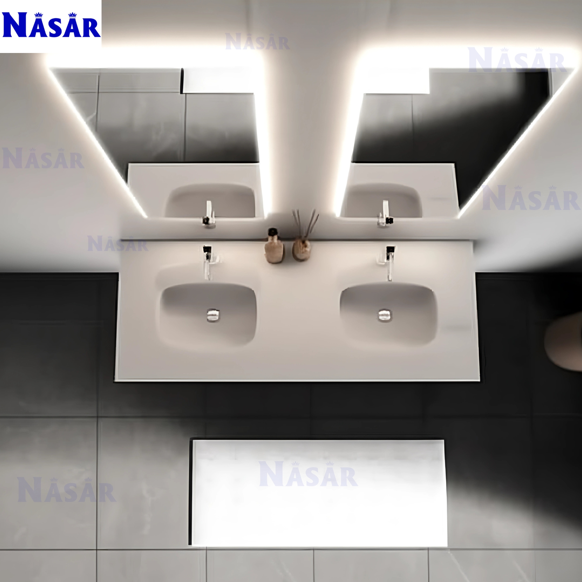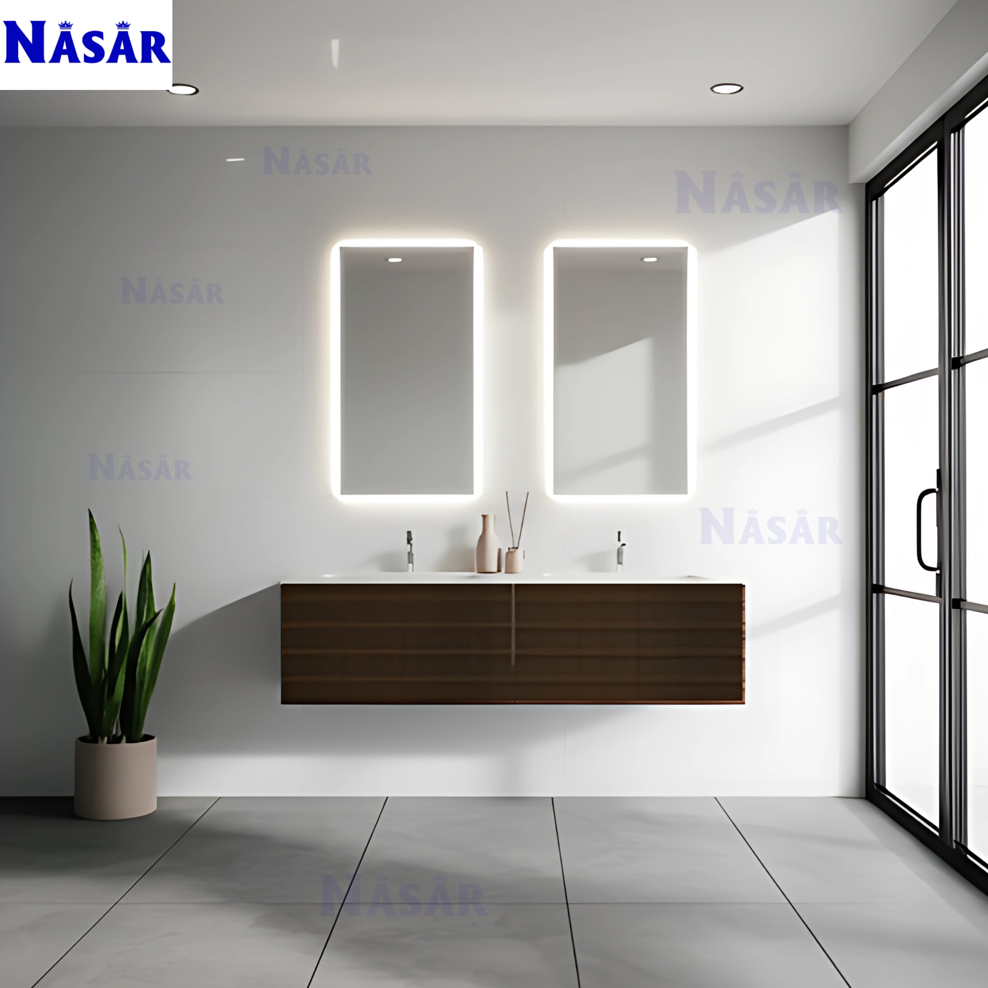Thiết kế đối xứng sang trọng: Tủ treo tường dài 1.5m được chia thành hai ngăn kéo lớn, kết hợp cùng chậu rửa đôi và cặp gương LED tạo nên một tổng thể hài hòa, cân đối.